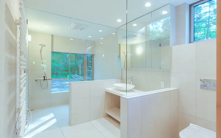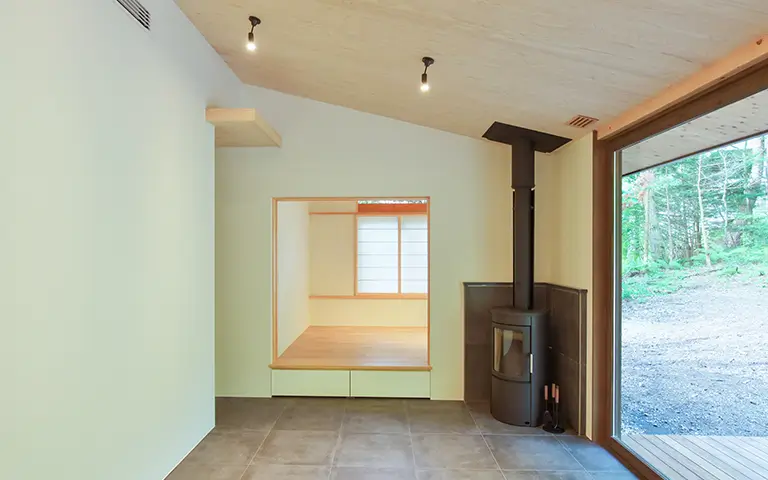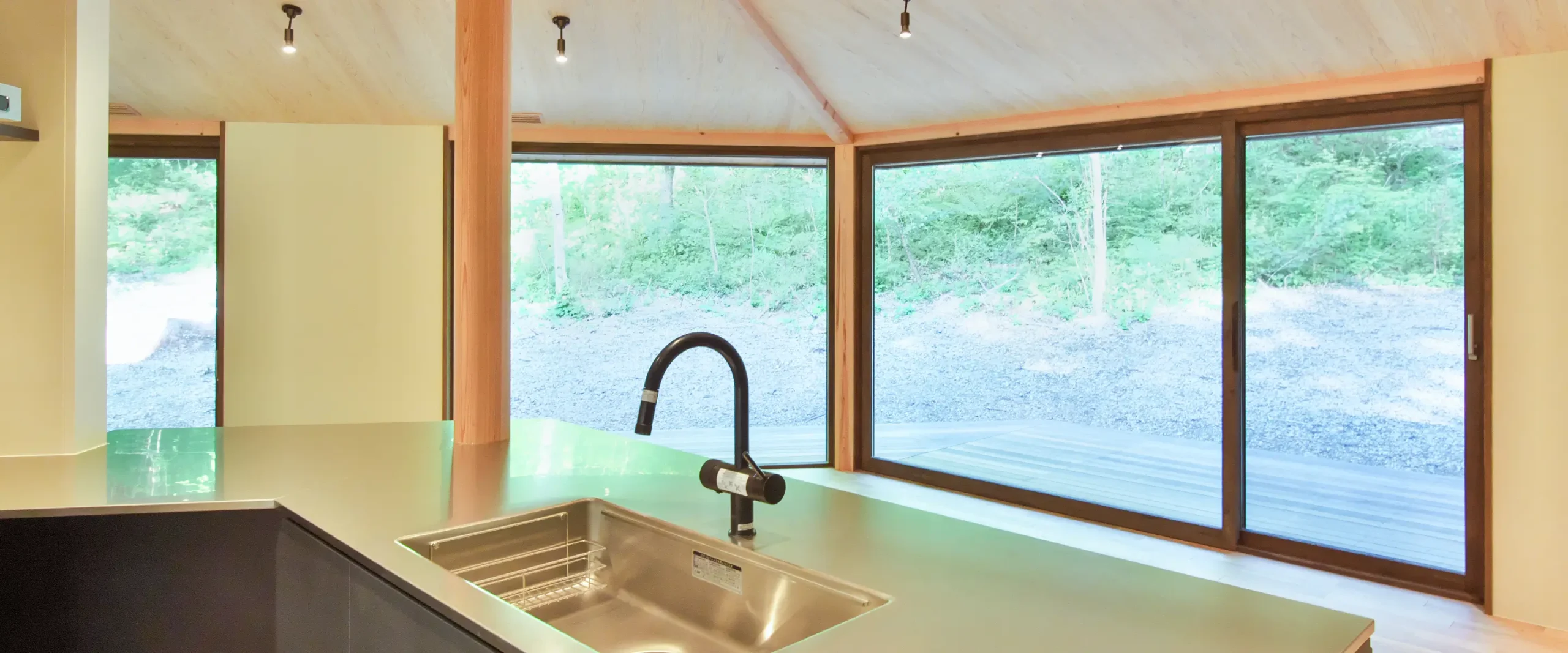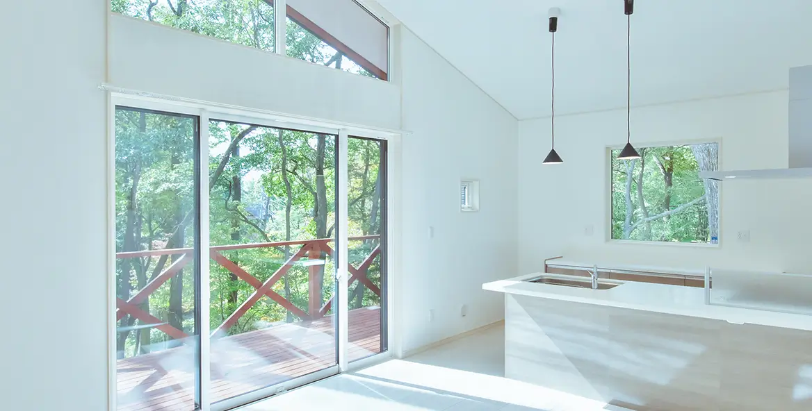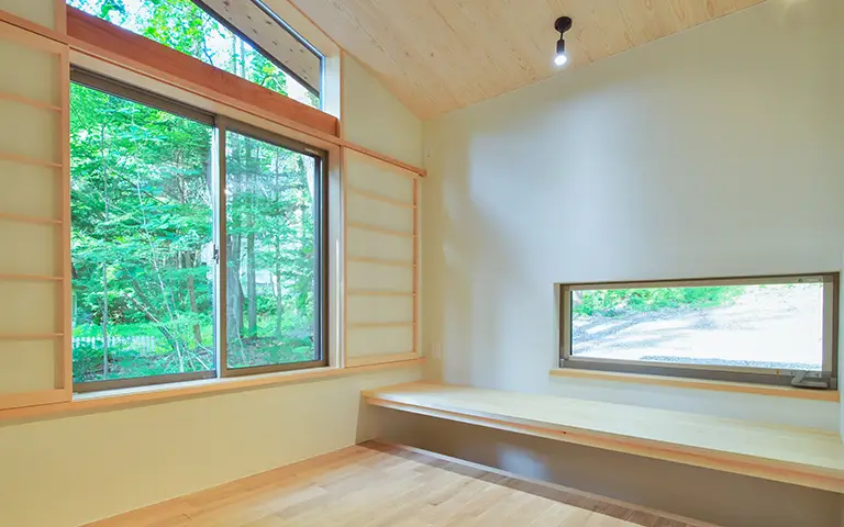 「室内にいながら森とつながる大きな窓。光と緑を取り込み、まるで自然の中に身を置いているような開放感を味わえます。」