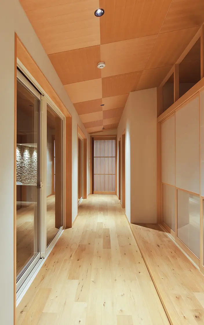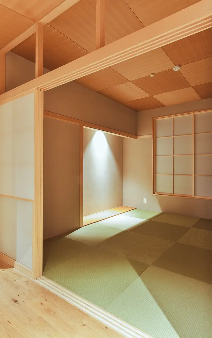 「木組みや障子から差し込む柔らかな光が、穏やかな時間を演出。現代的でありながら、和の心地よさを大切にした住まいです。」